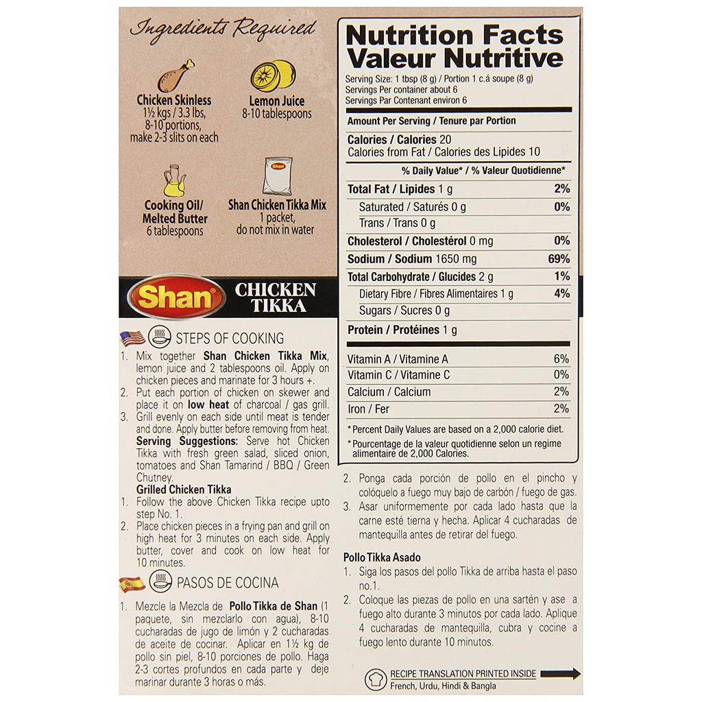 More images for shan chicken tikka masala ingredients » The grilled chicken thus made may then be added to a separately prepared sauce to create the ubiquitously popular chicken tikka masala dish. Mix together shan chicken tikka mix, lemon juice and 2 tablespoons oil. Apply on chicken pieces and marinate for 3 hours +. Grill evenly on each side until meat is tender and done.